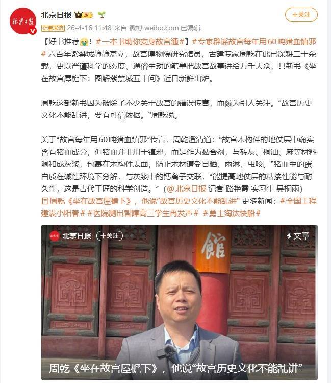关于“故宫每年用60吨猪血镇邪”传言,周乾澄清道:“故宫木构件的地仗层中确实含有猪血成分,但猪血并非用于镇邪,而是作为黏合剂,与砖灰、桐油、麻等材料调和成灰浆,包裹在木构件表面,防止木材遭受日晒、雨淋、虫咬。”猪血中的蛋白质在碱性环境下分解,与灰浆中的钙离子交联,“能提高地仗层的粘接性能与耐久性,这是古代工匠的科学创造。”