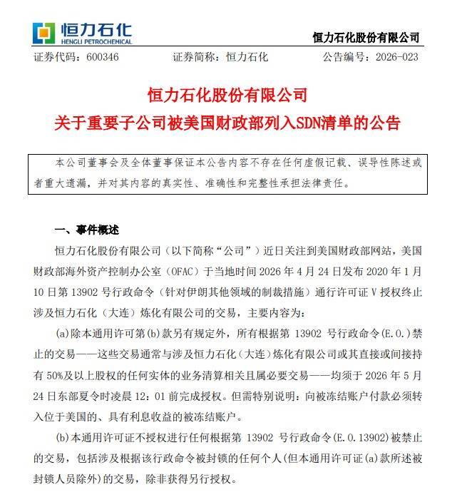 【大河财立方消息】4月26日,恒力石化公告称,近日关注到美国财政部海外资产控制办公室(OFAC)将重要子公司恒力石化(大连)炼化有限公司列入SDN清单。