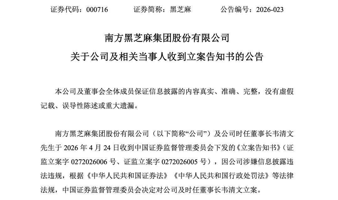 近日,南方黑芝麻集团股份有限公司(简称“黑芝麻”,000716.SZ)发布公告称,因公司涉嫌信息披露违法违规,中国证监会决定对公司及公司时任董事长韦清文立案调查。