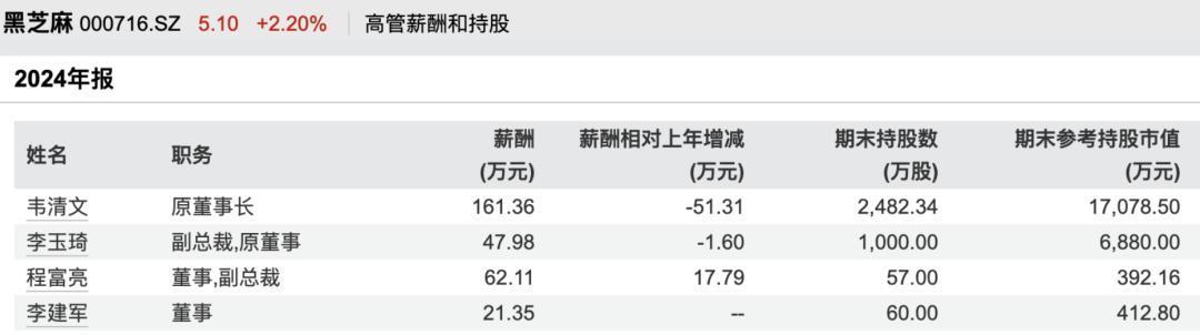 作为企业创始人,韦清文是黑芝麻发展的核心人物。他现年66岁,高级经济师,从2004年10月起长期担任上市公司董事长职务,直至2024年8月卸任。根据2024年年报,韦清文年薪为161.36万元,期末持股数量为2482.34万股,对应参考市值约1.71亿元。